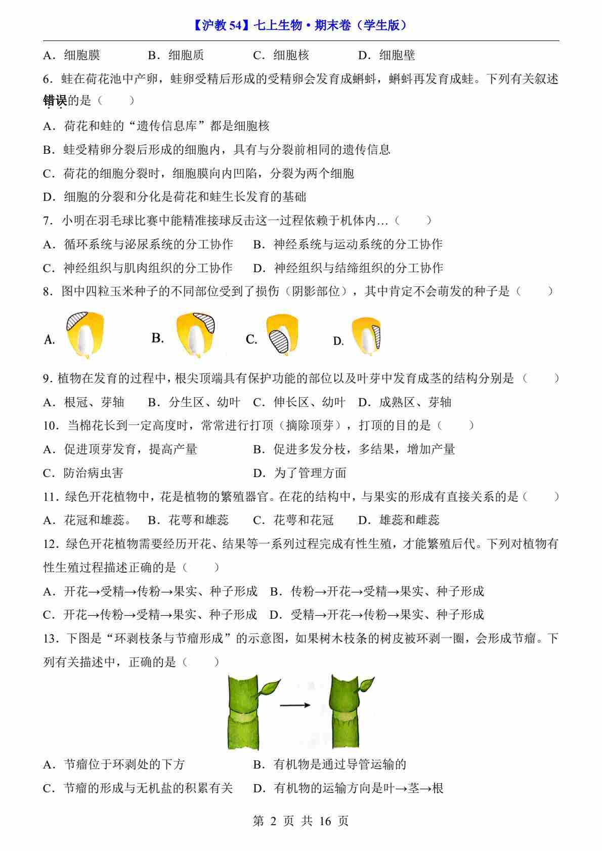 【沪教54】7上生物期末卷【七上全册】
