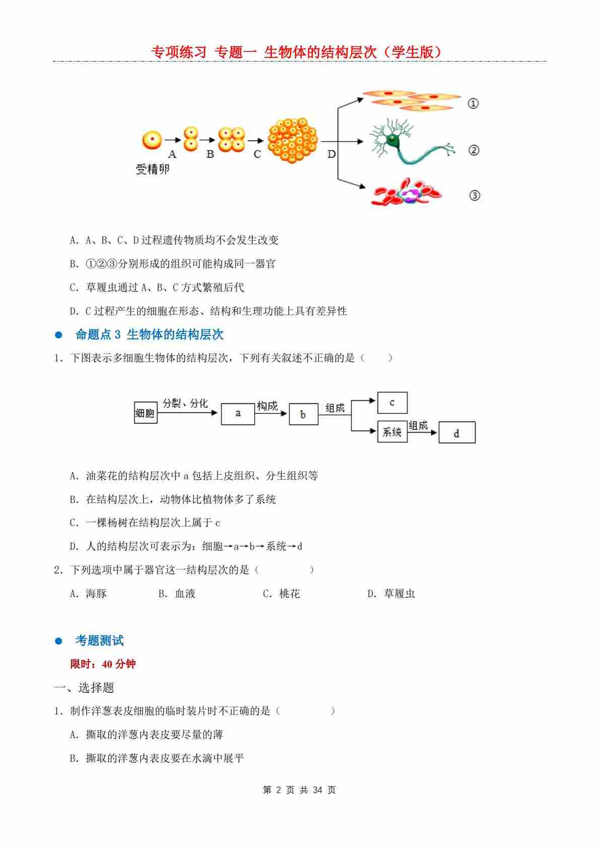 【专项练习】专题一 生物体的结构层次