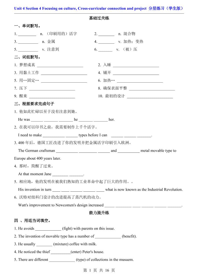 Unit 4 Section 4 Focusing on culture, Cross-curricular connection and project(分层练习)5
