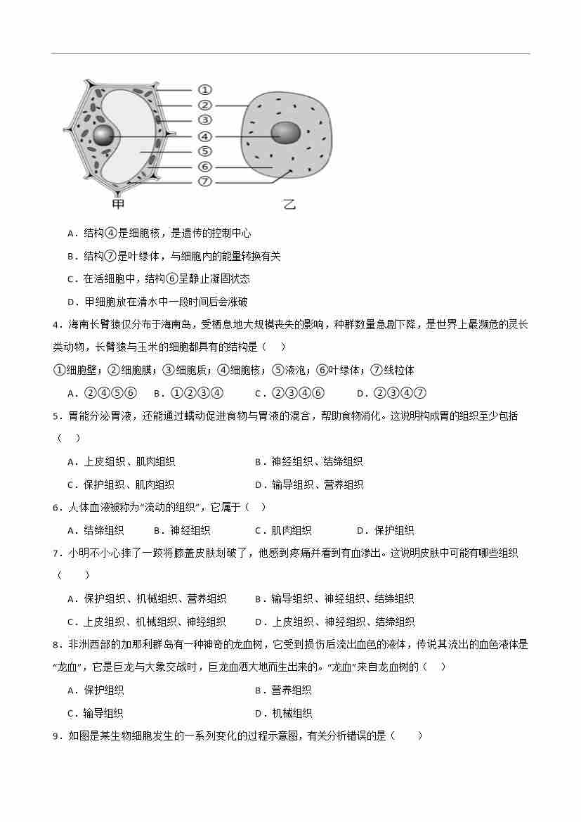 第一单元第2章 生物体具有一定的结构层次【单元测试卷】(原卷版)