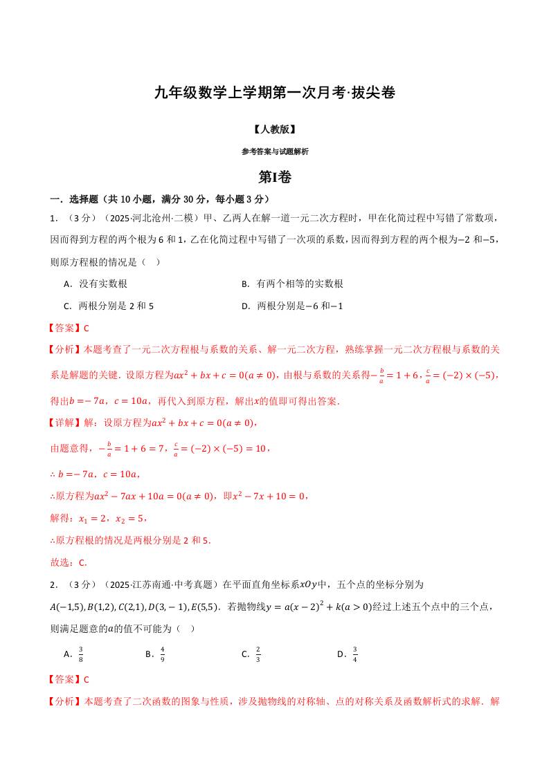 首页 > 全部 > 第一次月考 > 九年级数学上学期第一次月考·拔尖卷(人教版,举一反三)(教师版)