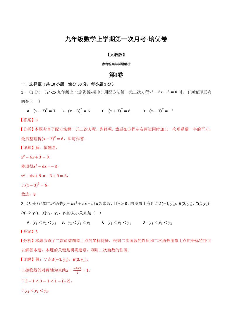 九年级数学上学期第一次月考·培优卷(人教版,举一反三)(教师版)