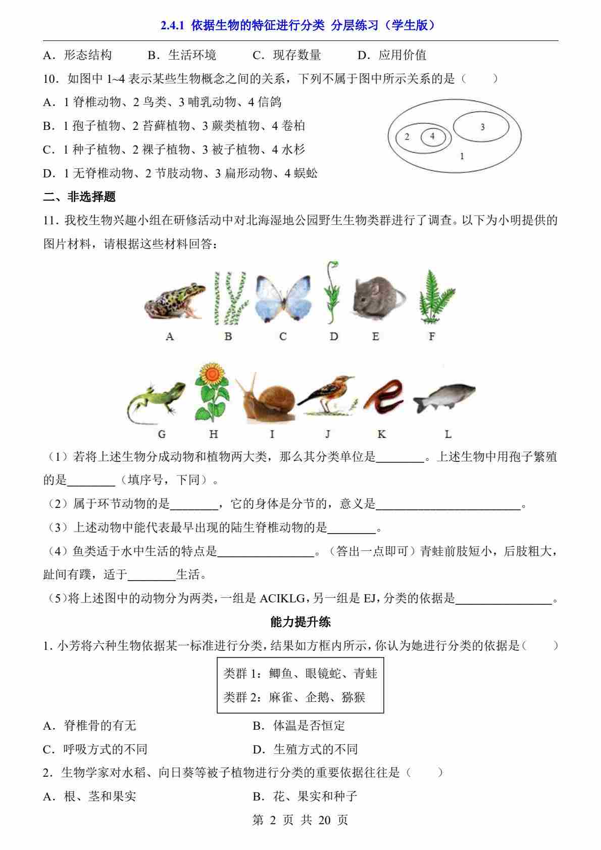 2.4.1 依据生物的特征进行分类(分层练习)
