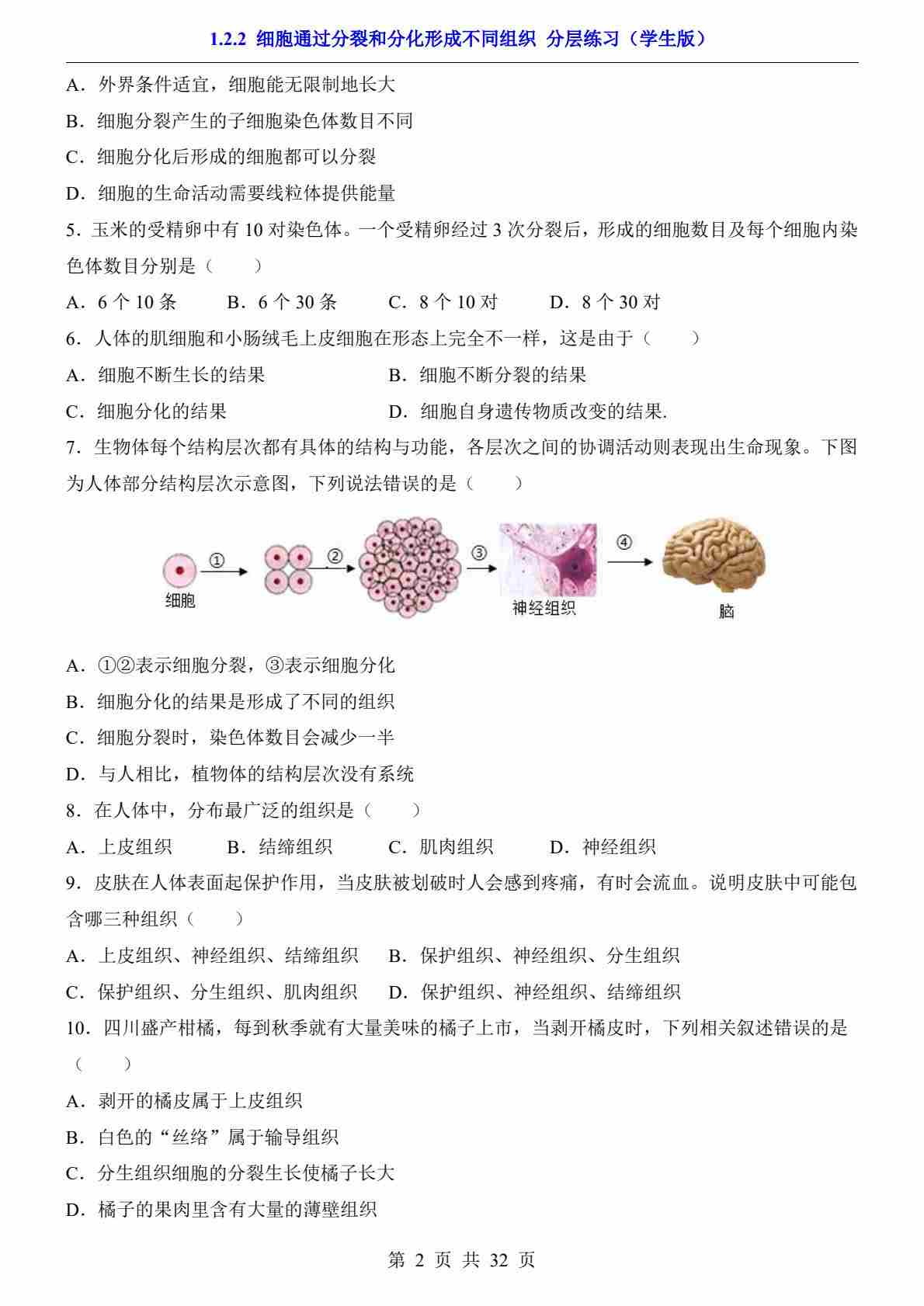 1.2.2 细胞通过分裂和分化形成不同组织(分层练习)