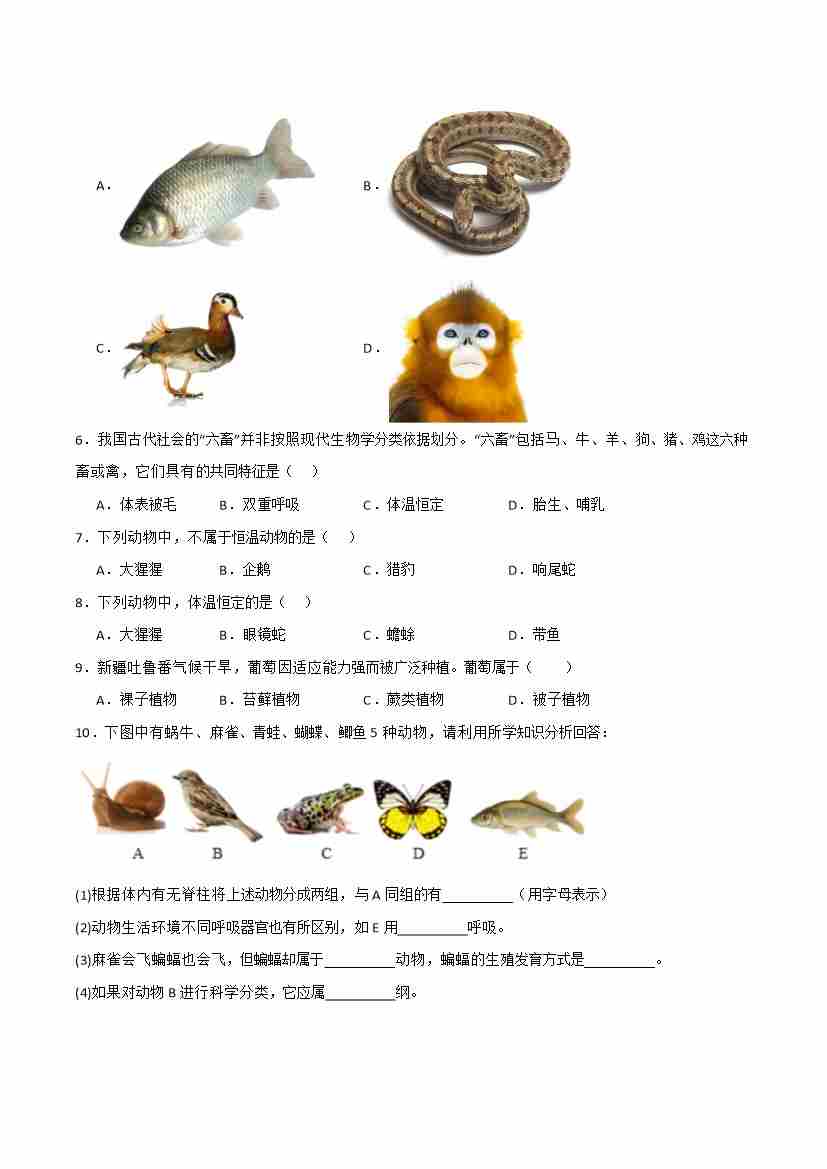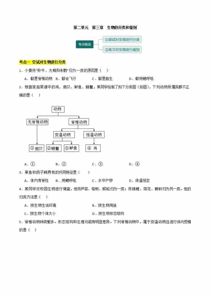 首页 > 全部 > 考点提升卷 > 第二单元第三章 生物的分类和鉴别【单元卷·考点卷】(原卷版)-七年级生物上册(冀少版2024)