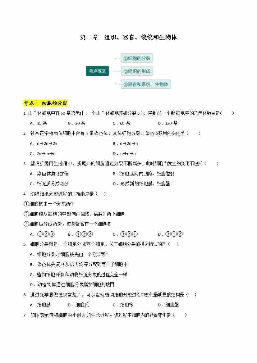 首页 > 全部 > 考点提升卷 > 第二章 组织、器官、系统和生物体【单元卷·考点卷】(原卷版)-七年级生物上册(冀少版2024)