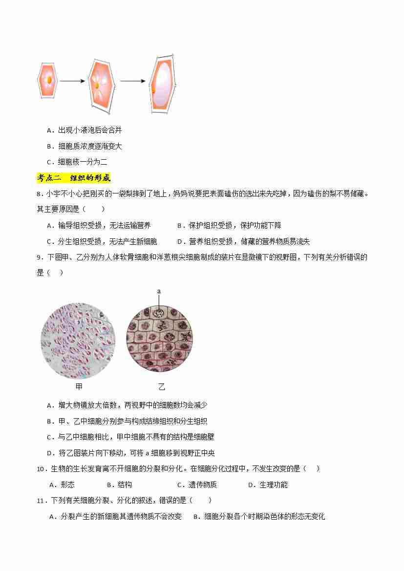 第二章 组织、器官、系统和生物体【单元卷·考点卷】(原卷版)-七年级生物上册(冀少版2024)