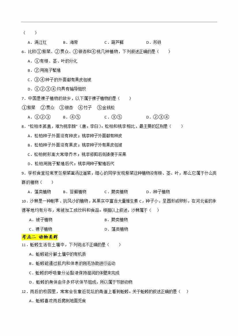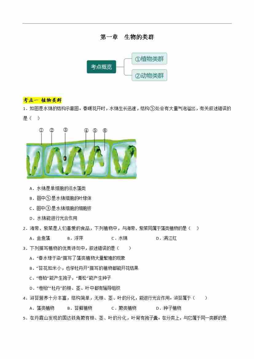 首页 > 全部 > 考点提升卷 > 第一章 生物的类群【单元卷·考点卷】(原卷版)-七年级生物上册(冀少版2024)