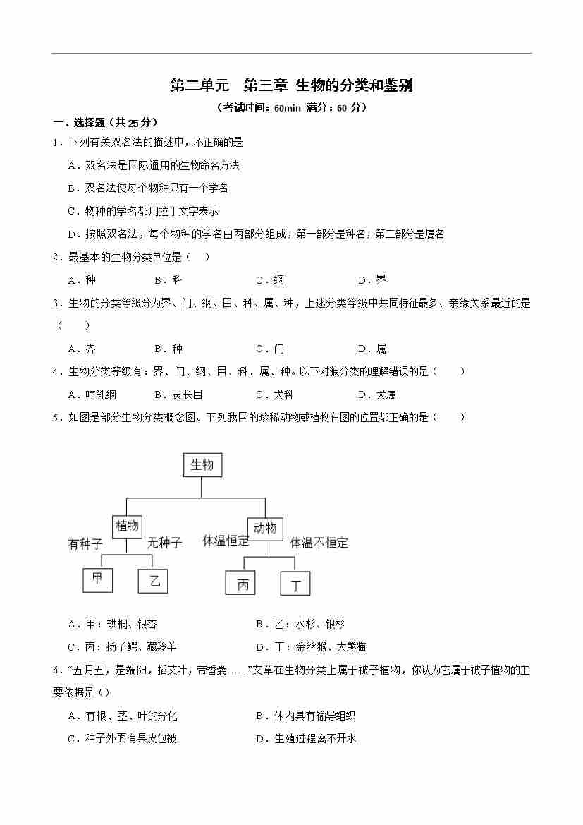 第二单元第三章 生物的分类和鉴别【单元卷·测试卷】(原卷版)-七年级生物上册(冀少版2024)