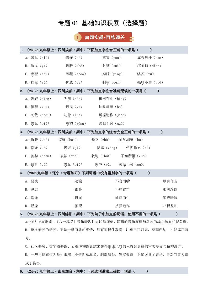 首页 > 全部 > 期中复习 > 专题01 基础知识积累·选择题(期中专项训练)(学生版)