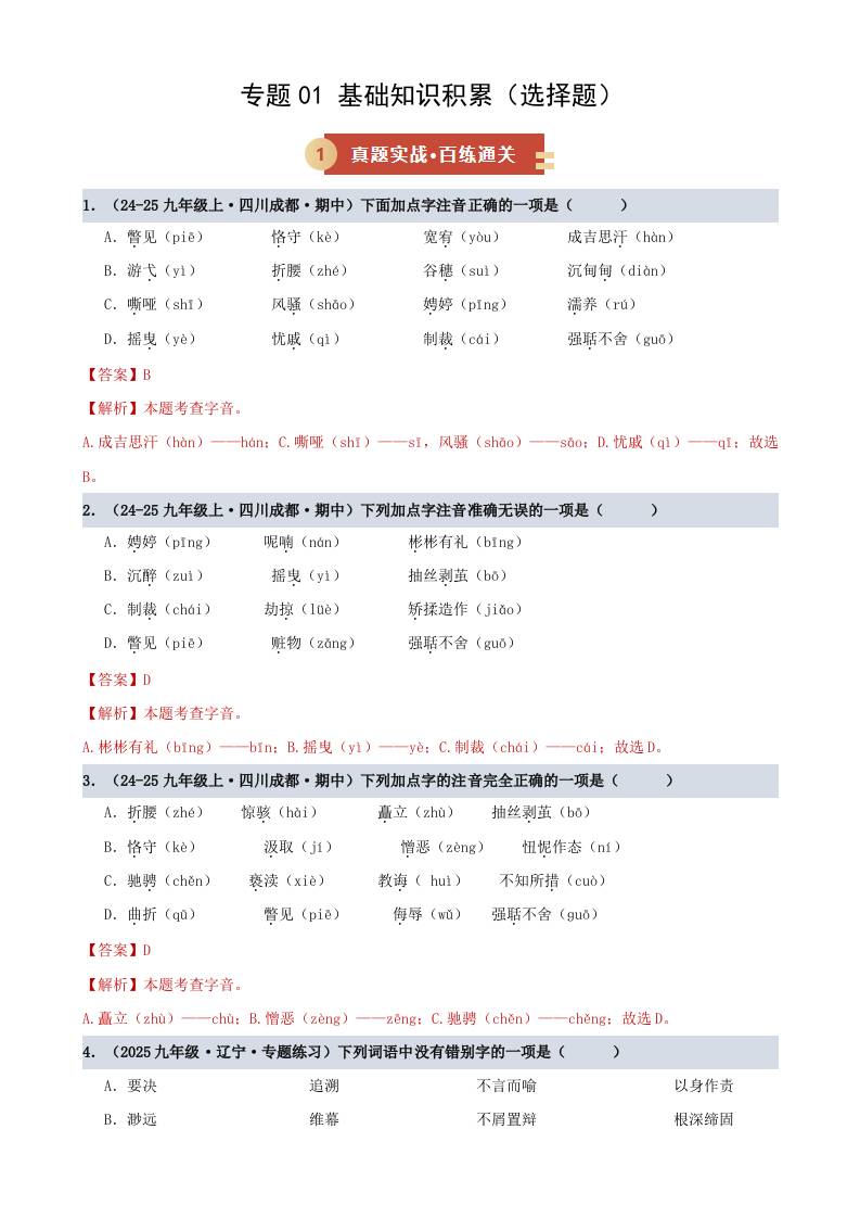 首页 > 全部 > 期中复习 > 专题01 基础知识积累·选择题(期中专项训练)(教师版)
