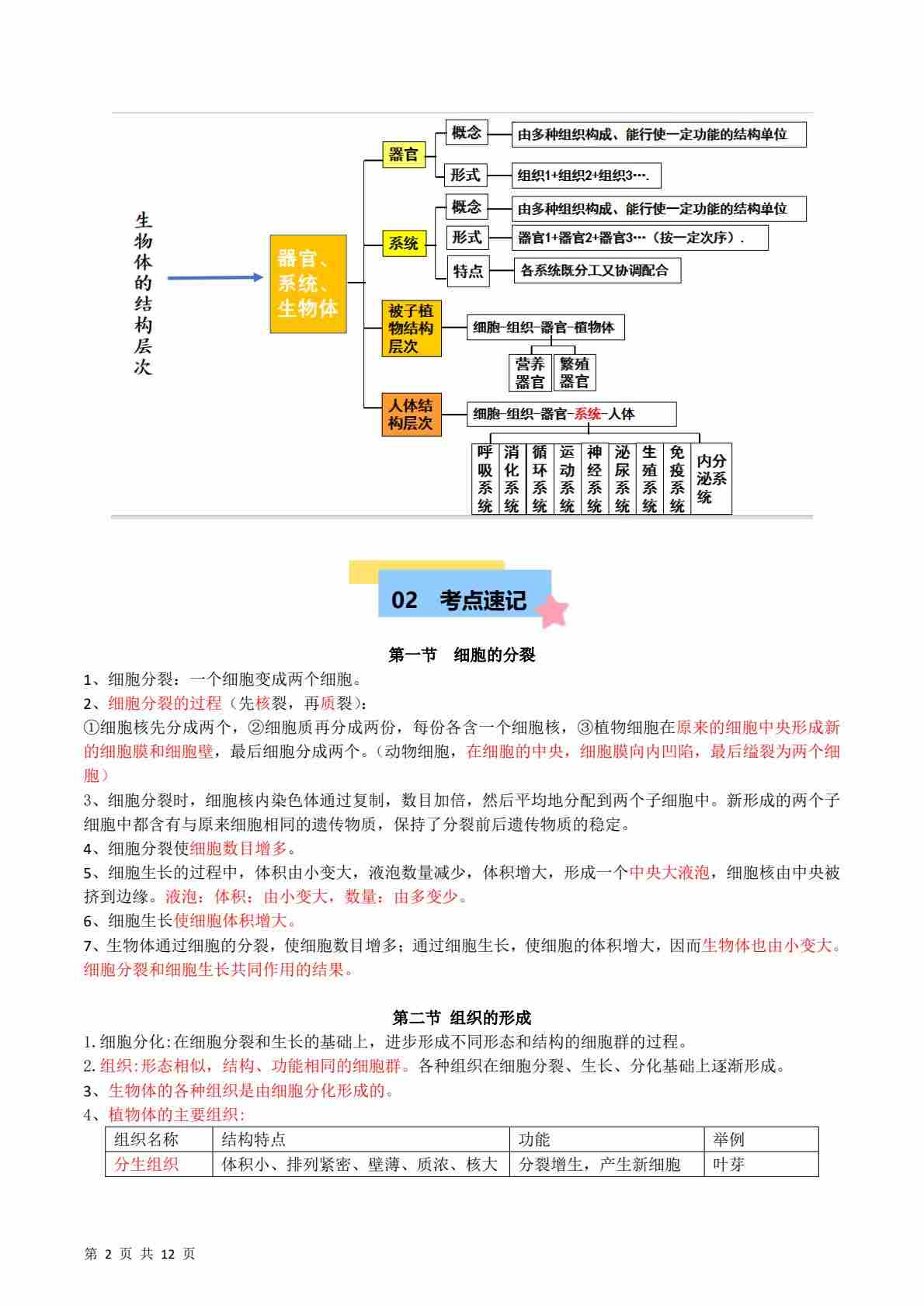 首页 > 全部 > 速记清单 > 【2】第一单元第二章 组织、器官、系统和生物体【速记清单】(解析版)