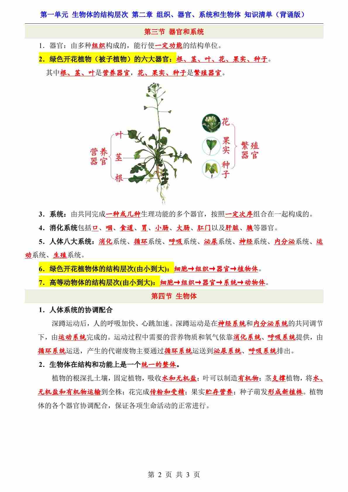 第1单元 第2章 组织、器官、系统和生物体(知识清单-背诵版)