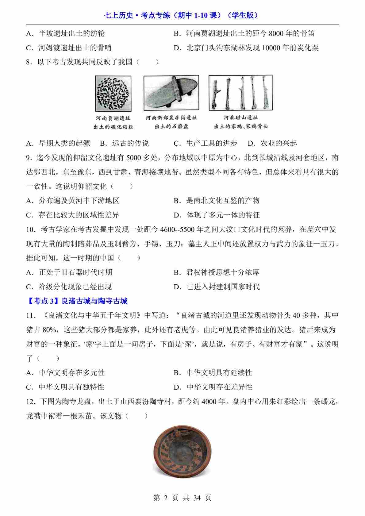 七上历史期中考点专练(1-10课)