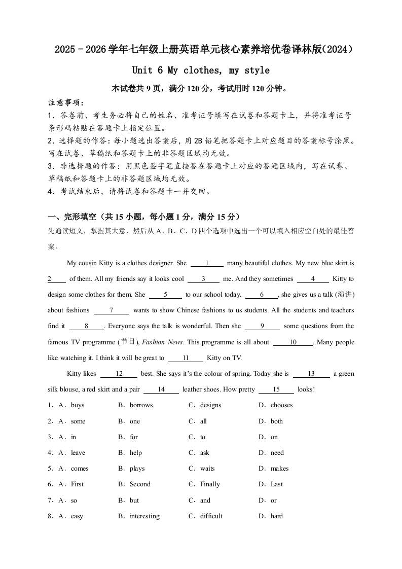 (单元培优卷)Unit 6 My clothes, my style 单元核心素养培优卷(含答案解析)-2025 - 2026学年七年级上册英语译林版(2024)
