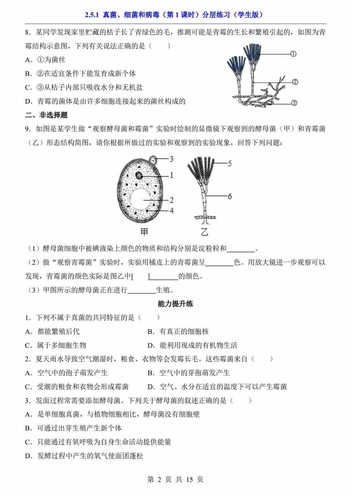 2.5.1 真菌、细菌和病毒 第1课时(分层练习)