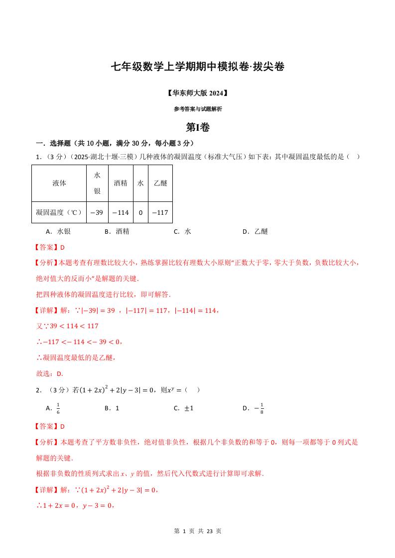七年级数学上学期期中模拟卷·拔尖卷(华东师大版2024,举一反三)(解析版)1