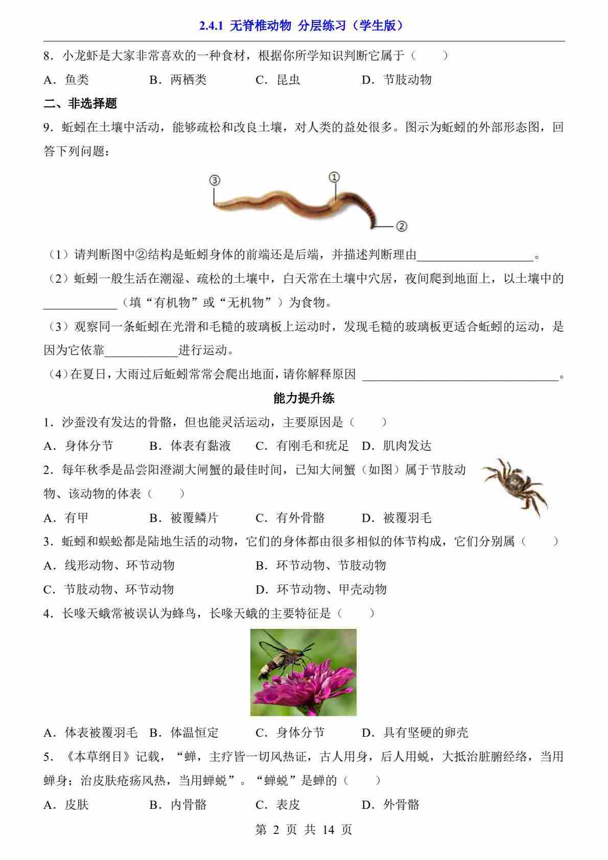 2.4.1 无脊椎动物(分层练习)