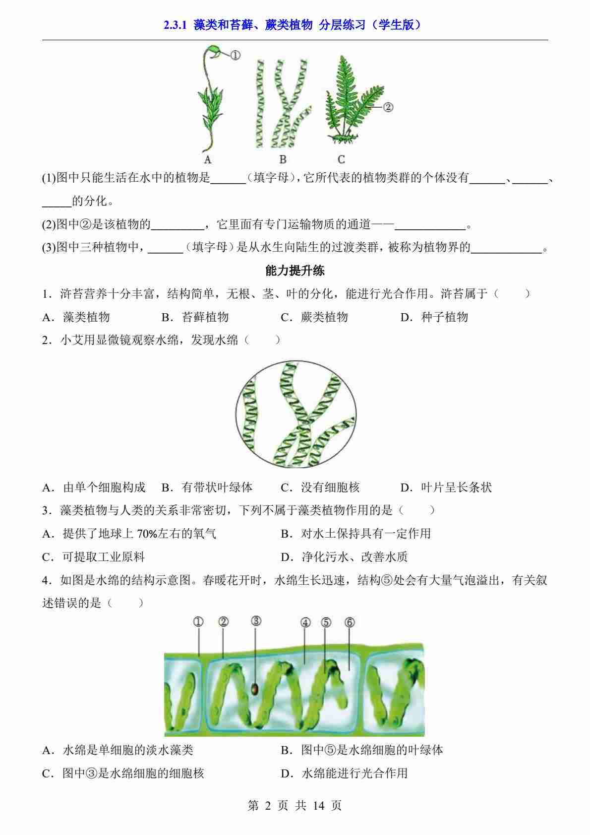 2.3.1 藻类和苔藓、蕨类植物(分层练习)