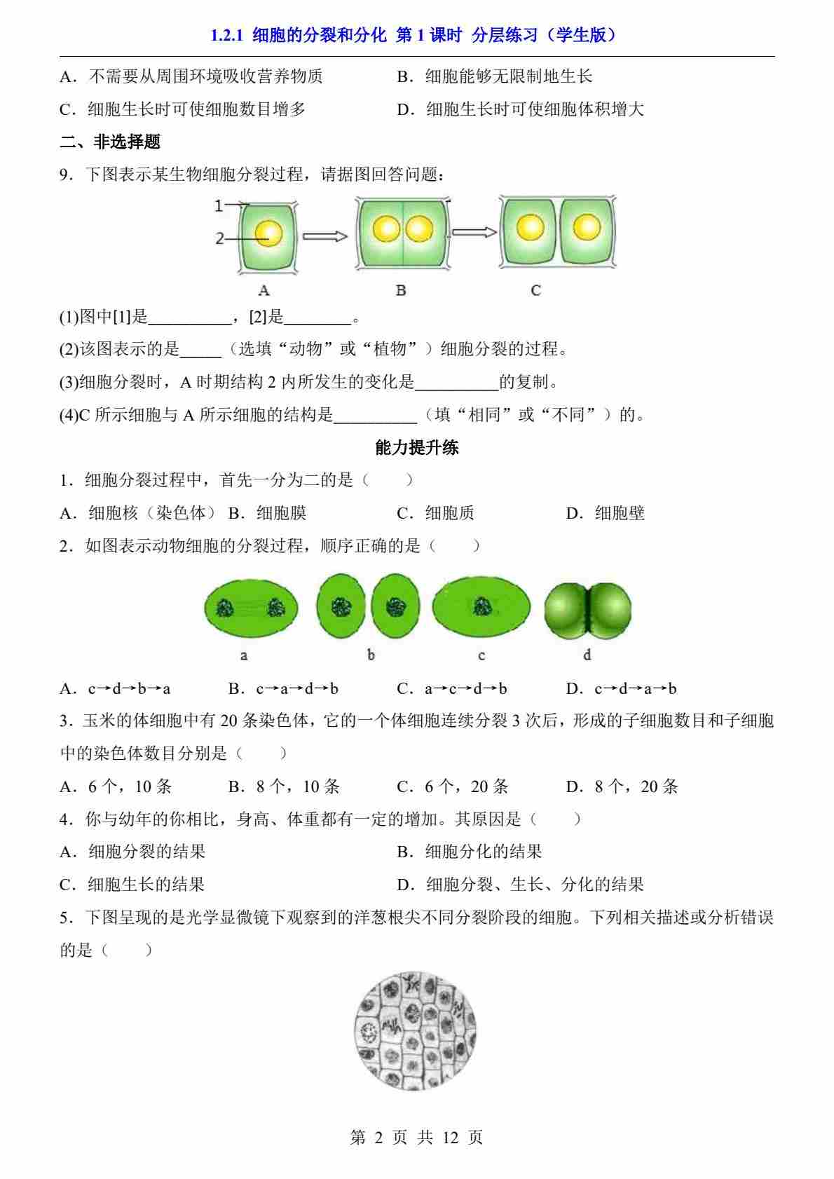 首页 > 全部 > 一课一练 > 1.2.1 细胞的分裂和分化 第1课时(分层练习)