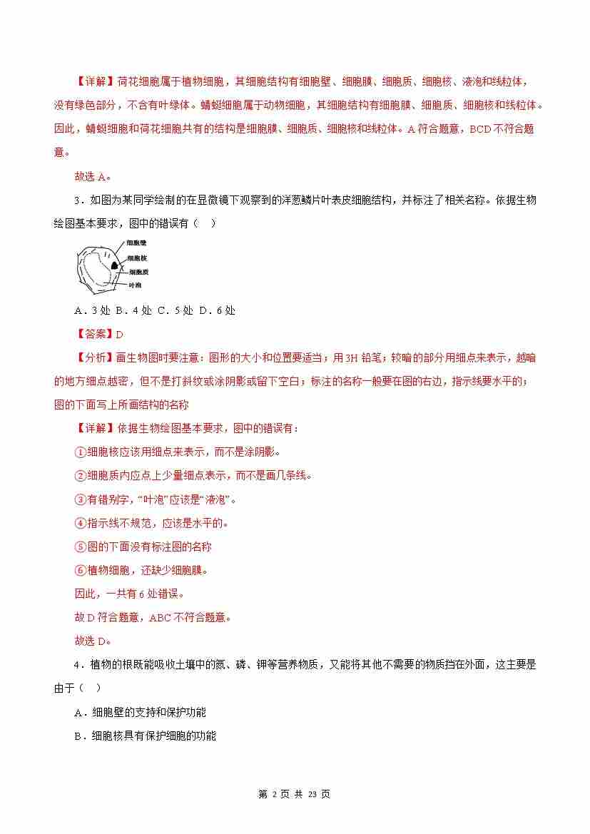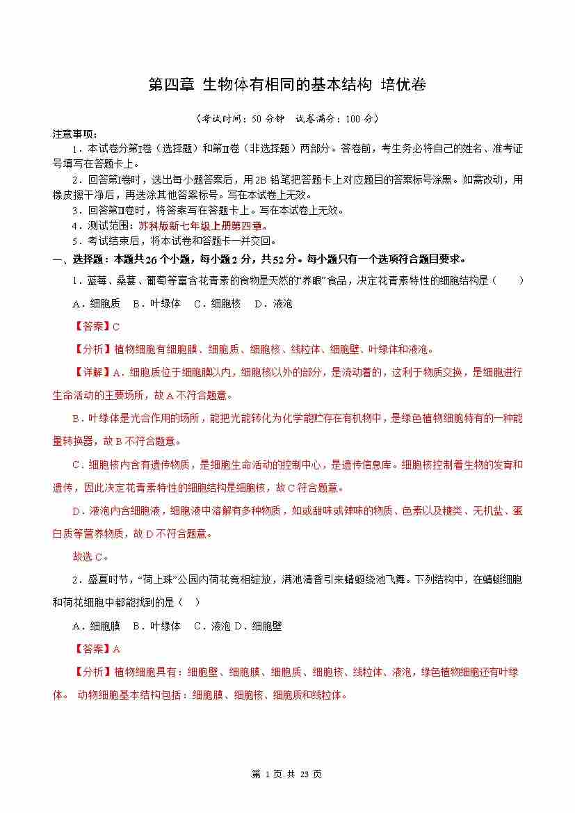 第4章 生物体有相同的基本结构【B卷·培优卷】(解析版)-七年级生物上册生物(苏科版2024)