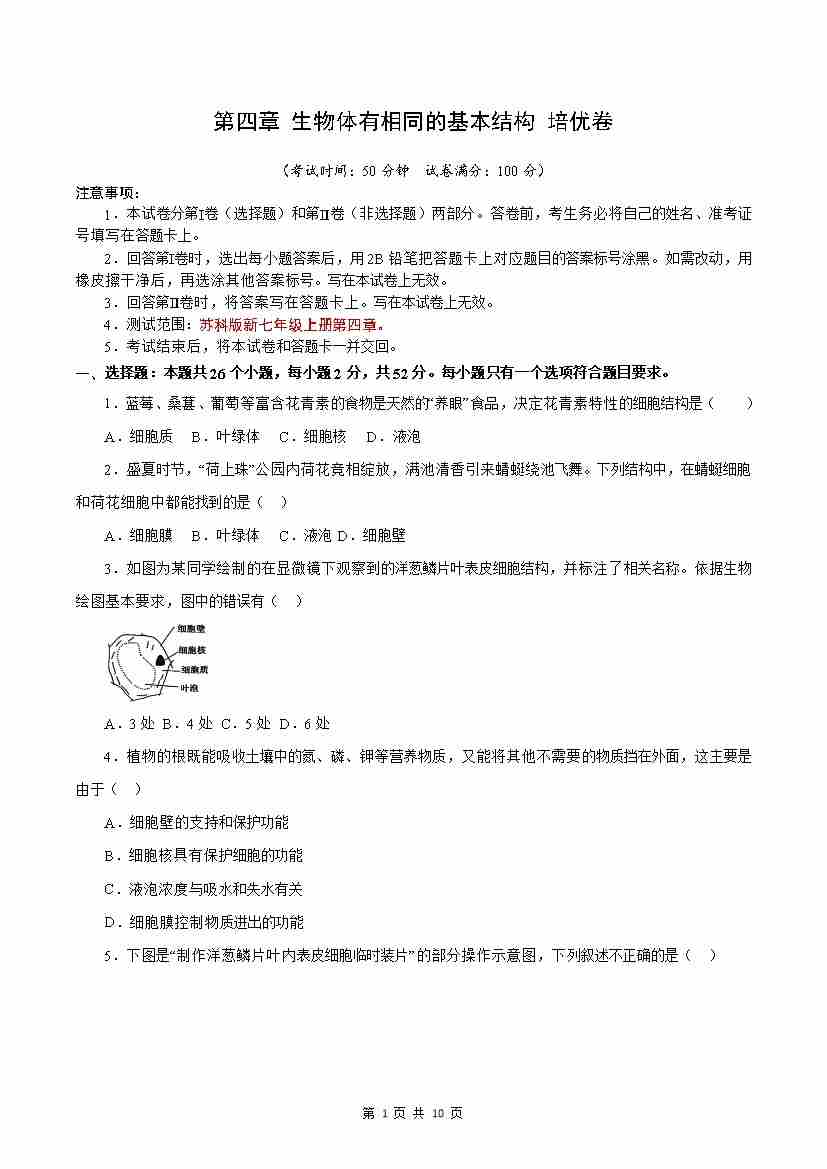 第4章 生物体有相同的基本结构【B卷·培优卷】(原卷版)-七年级生物上册生物(苏科版2024)