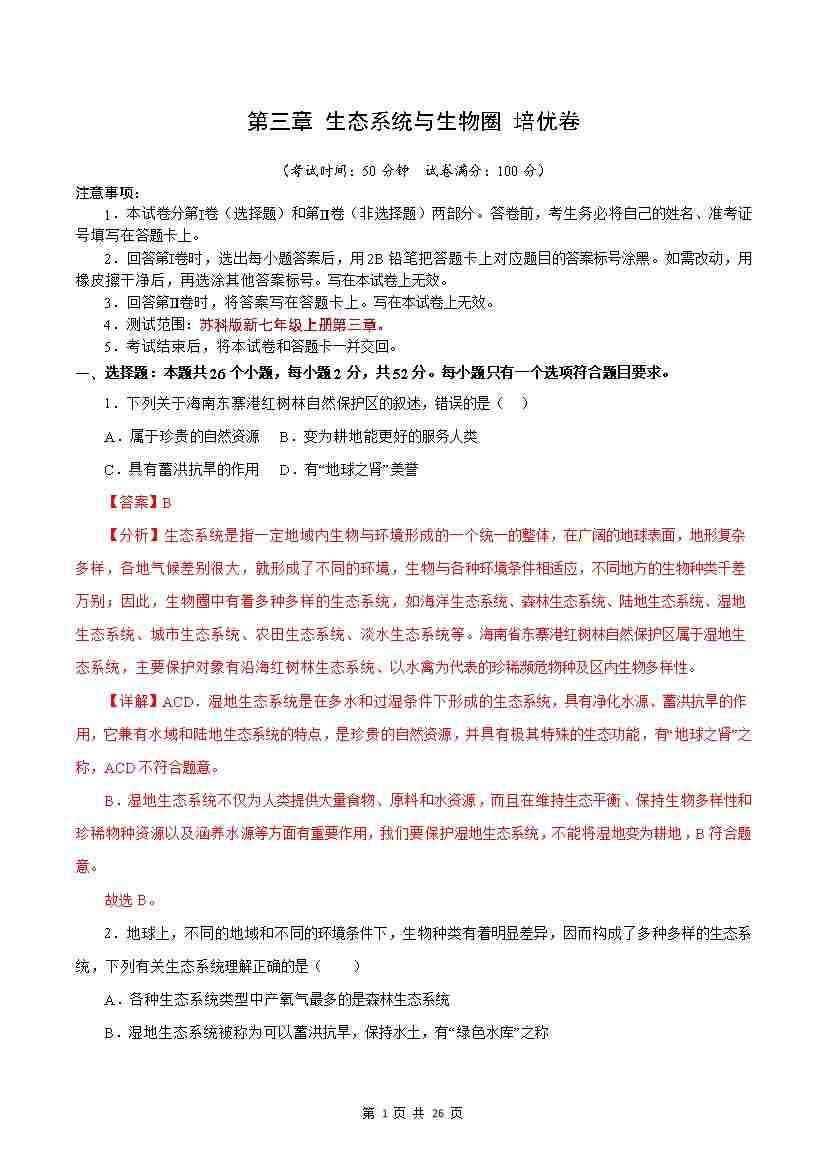 第3章 生态系统和生物圈【B卷·培优卷】(解析版)-七年级生物上册生物(苏科版2024)