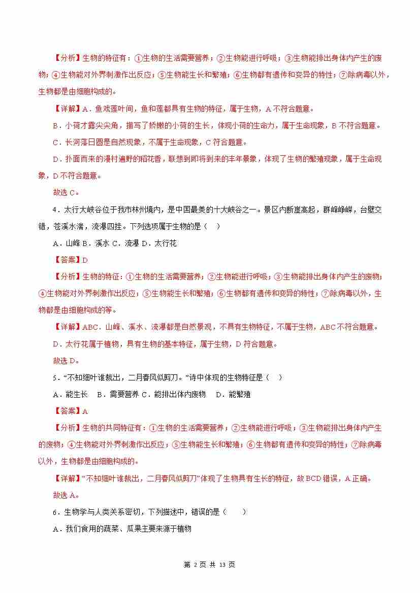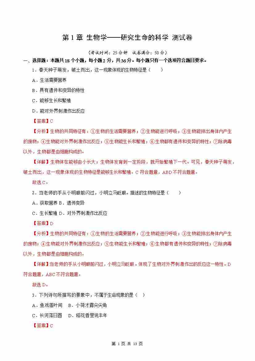 首页 > 全部 > 能力提升卷 > 第1章 生物学——研究生命的科学【测试卷】(解析版)-七年级生物上册生物(苏科版2024)