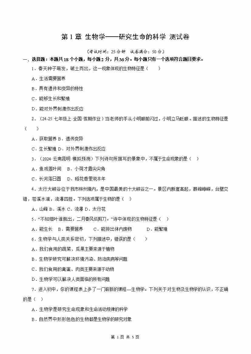 首页 > 全部 > 能力提升卷 > 第1章 生物学——研究生命的科学【测试卷】(原卷版)-七年级生物上册生物(苏科版2024)