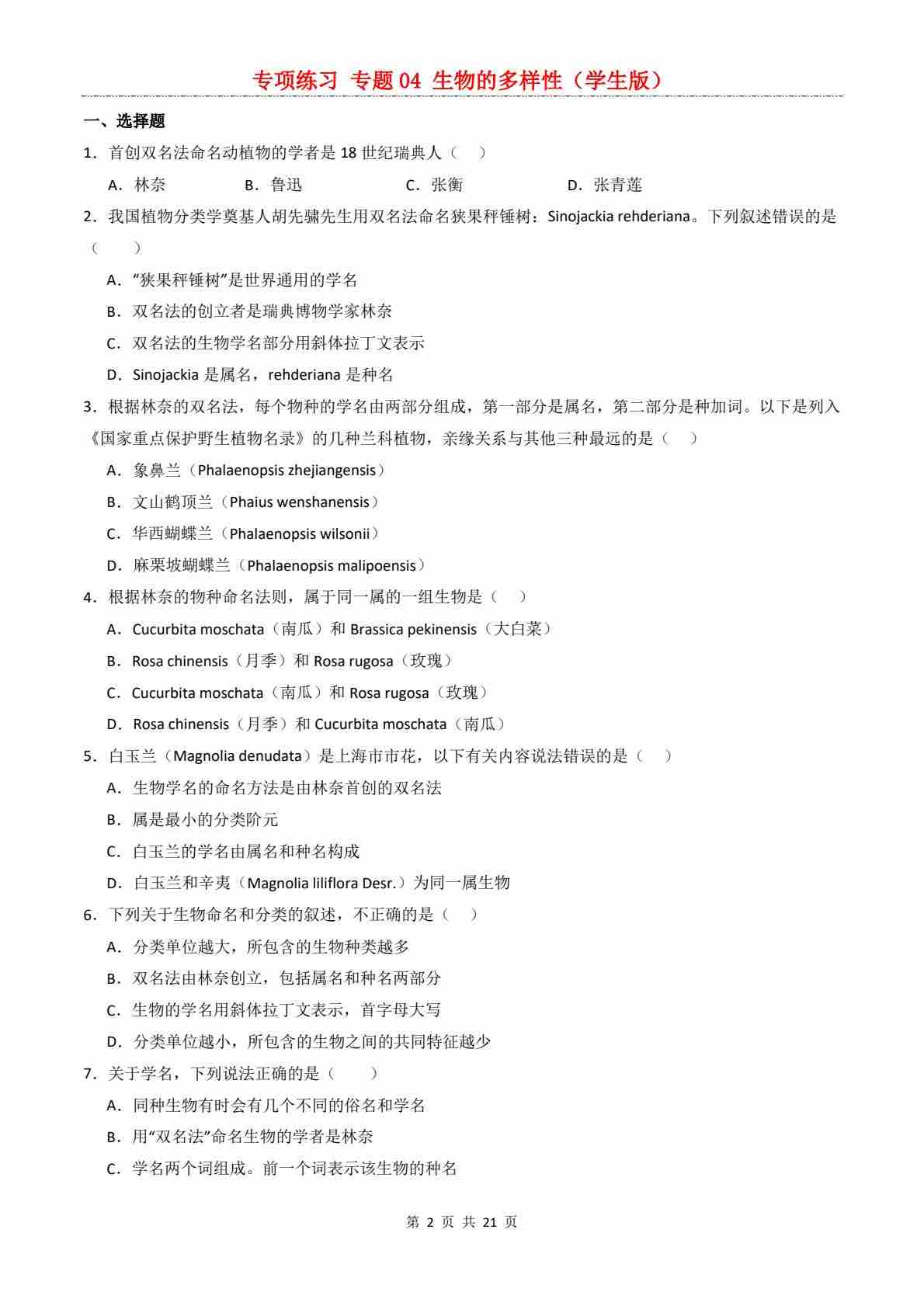 首页 > 全部 > 期末专项 > 【专项练习】专题04 生物的多样性
