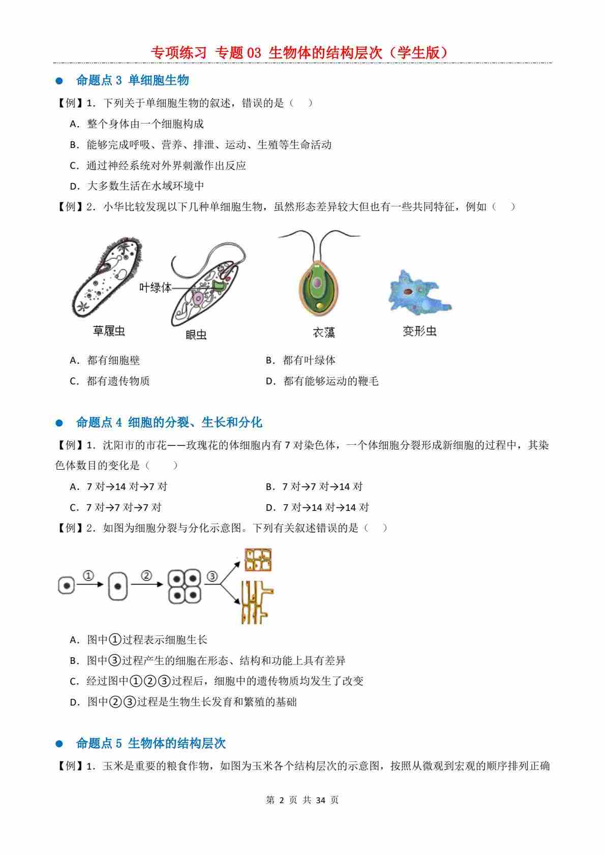 首页 > 全部 > 期末专项 > 【专项练习】专题03 生物体的结构层次