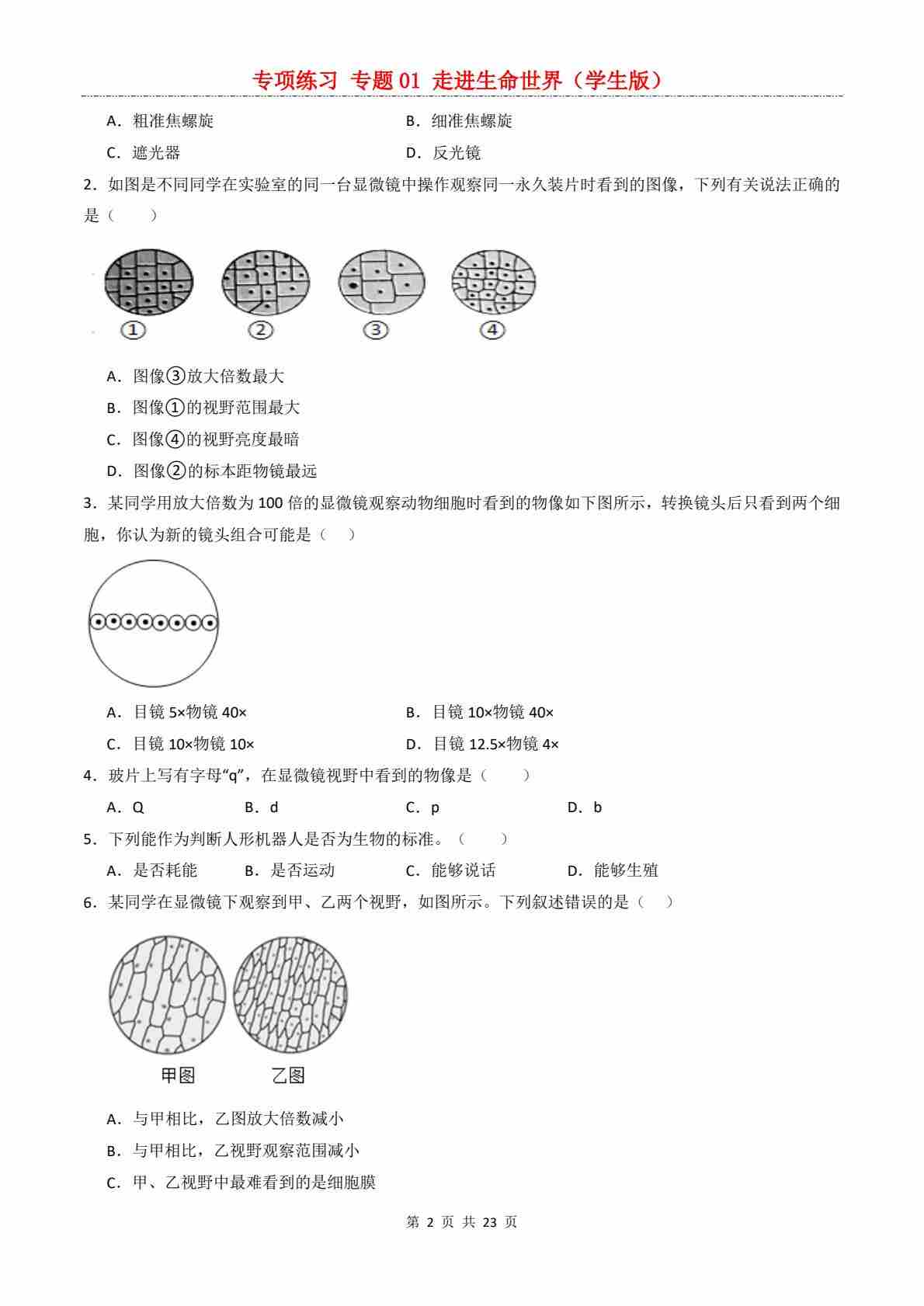 首页 > 全部 > 期末专项 > 【专项练习】专题01 走进生命世界