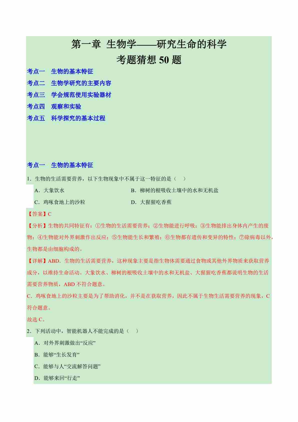 【期中专题训练】第一章 生物学——研究生命的科学(考题猜想50题)(解析版)