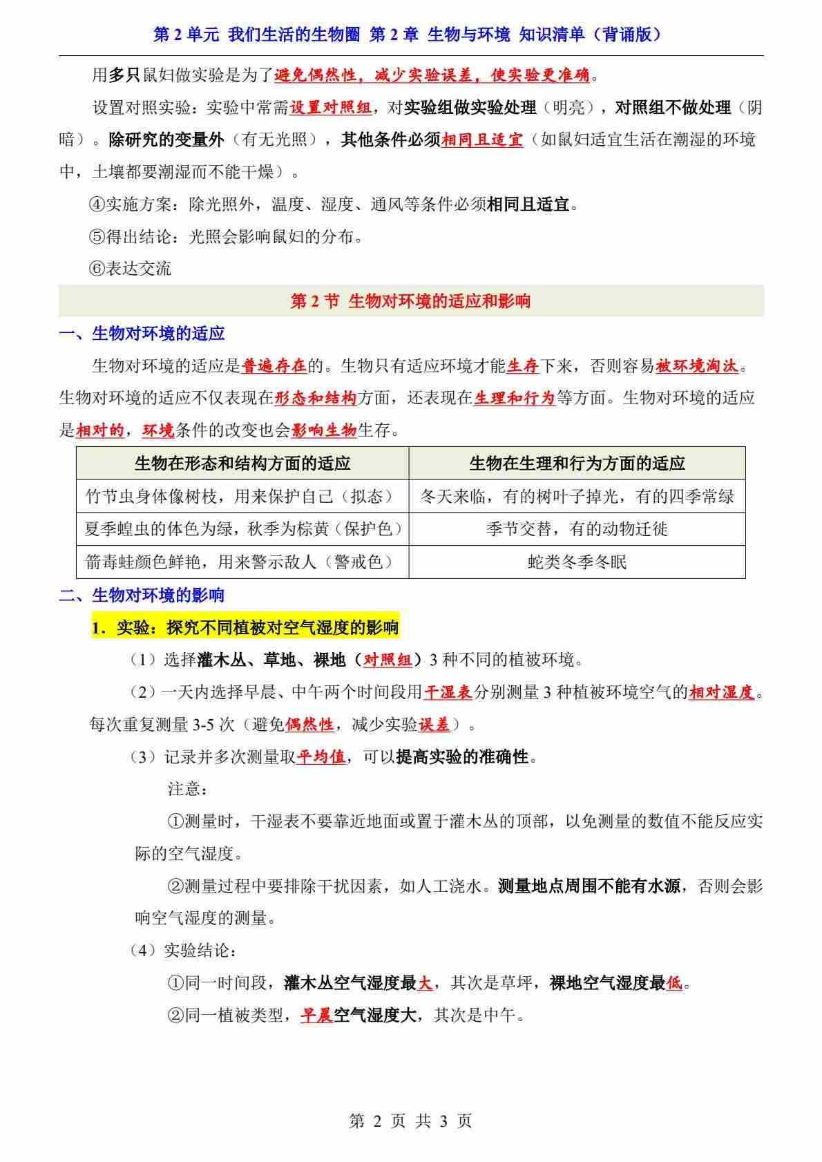 第2单元 第2章 生物与环境(知识清单-背诵版)
