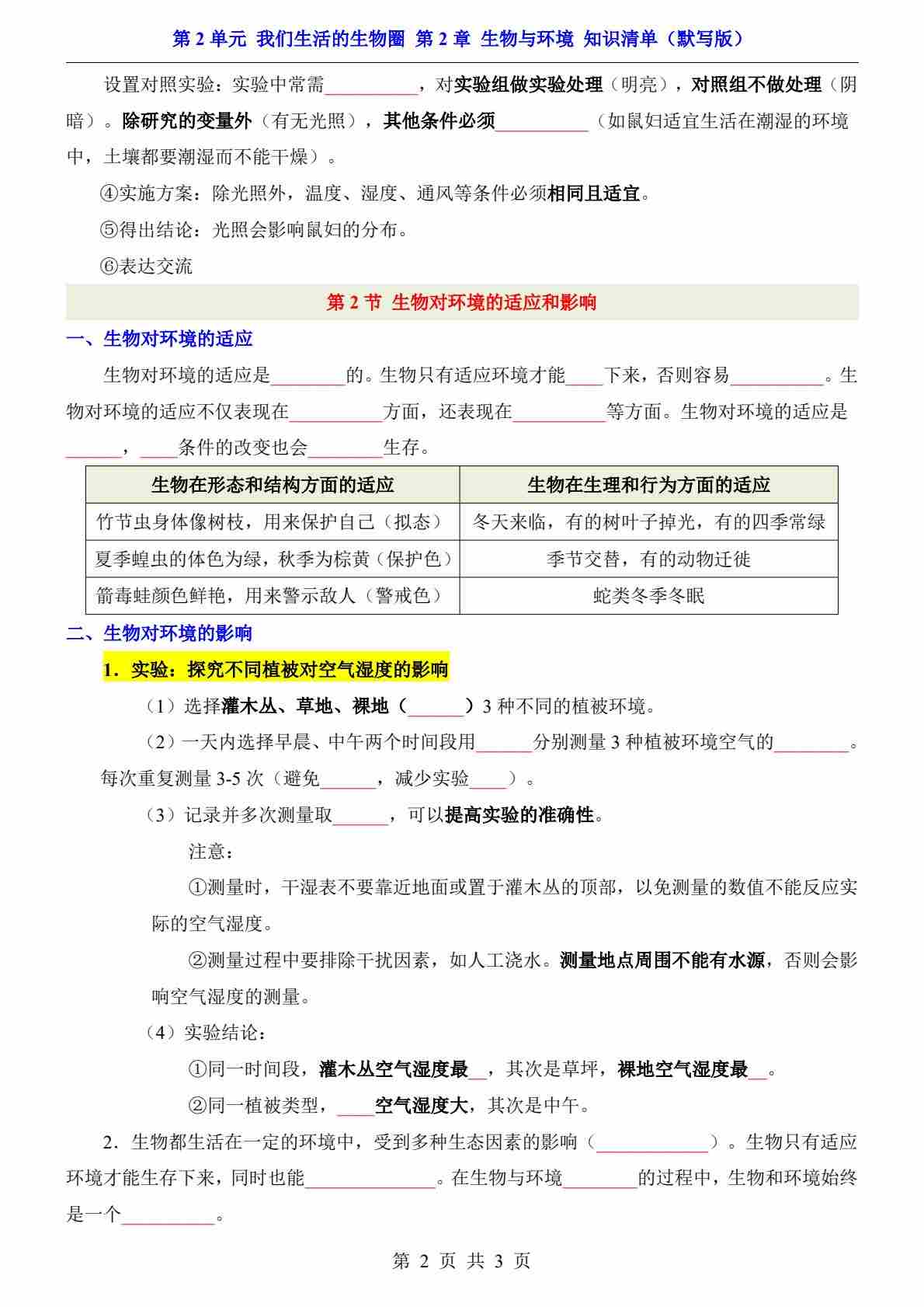 首页 > 全部 > 知识梳理 > 第2单元 第2章 生物与环境(知识清单-默写版)