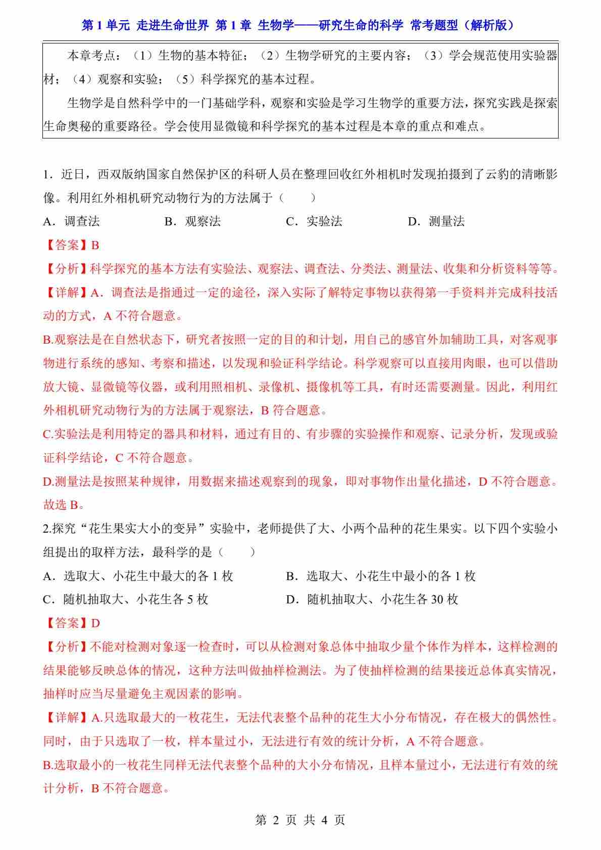 第1章 生物学—研究生命的科学(常考题型)