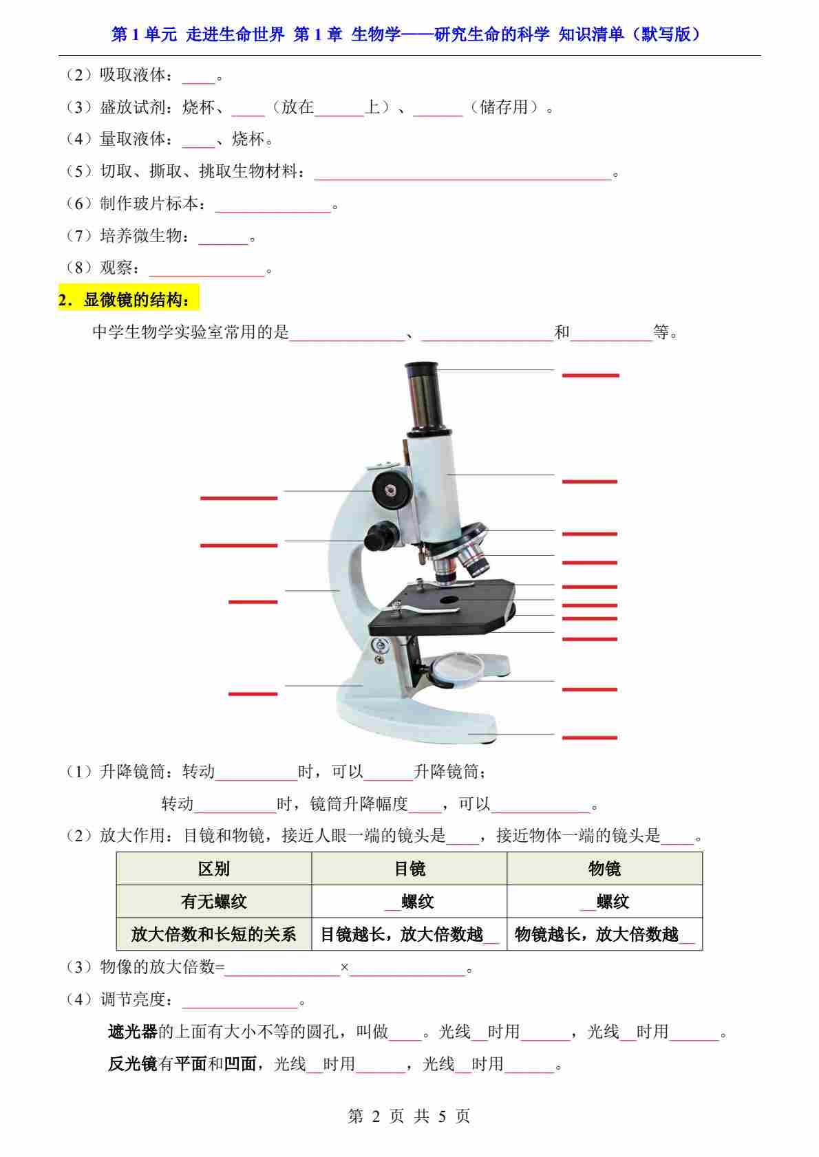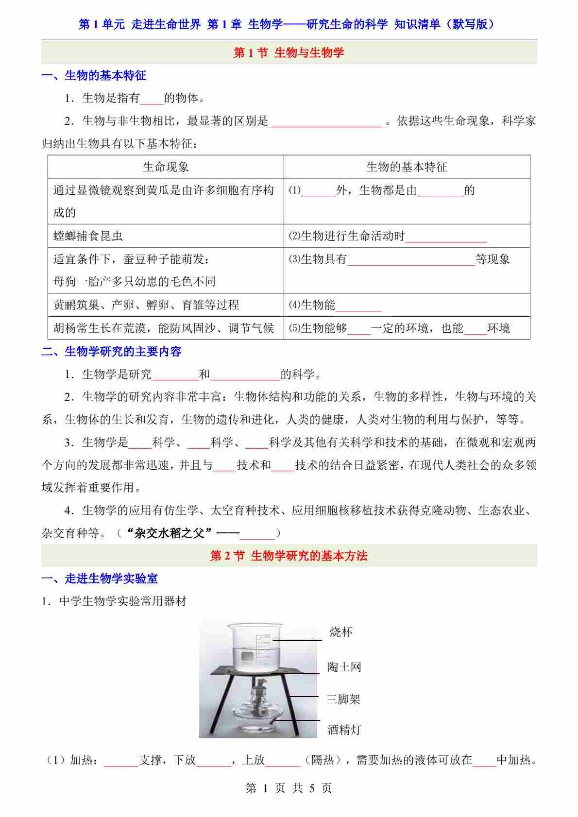 首页 > 全部 > 知识梳理 > 第1单元 第1章 生物学—研究生命的科学(知识清单-默写版)