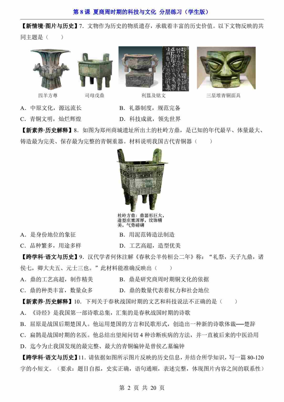 首页 > 全部 > 一课一练 > 第8课 夏商周时期的科技与文化(分层练习)