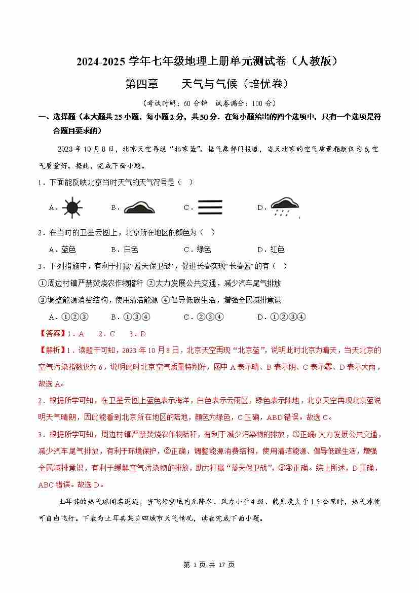 首页 > 全部 > 单元培优卷 > 第4章 天气与气候【A卷·培优卷】(解析版)