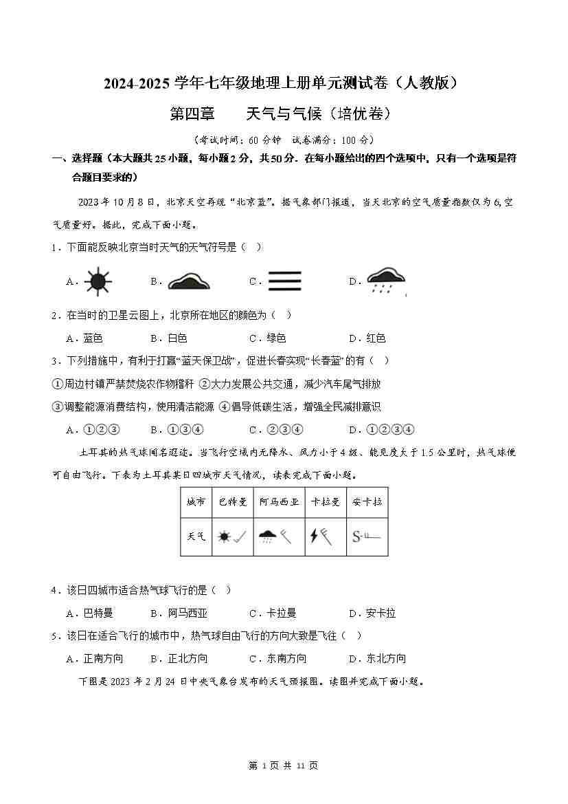 第4章 天气与气候【A卷·培优卷】(原卷版)