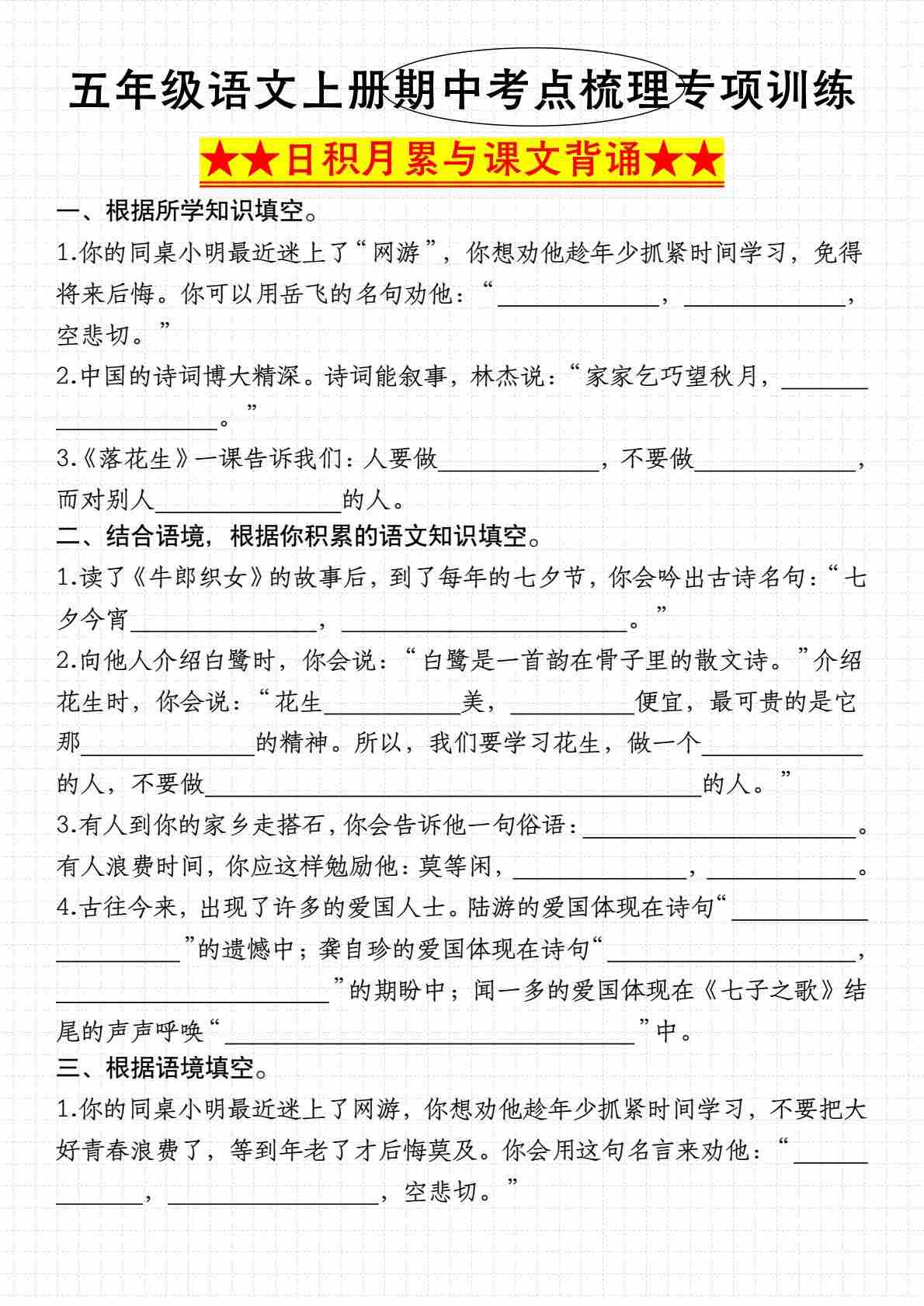 五(上)语文期中考点梳理——日积月累与课文背诵》