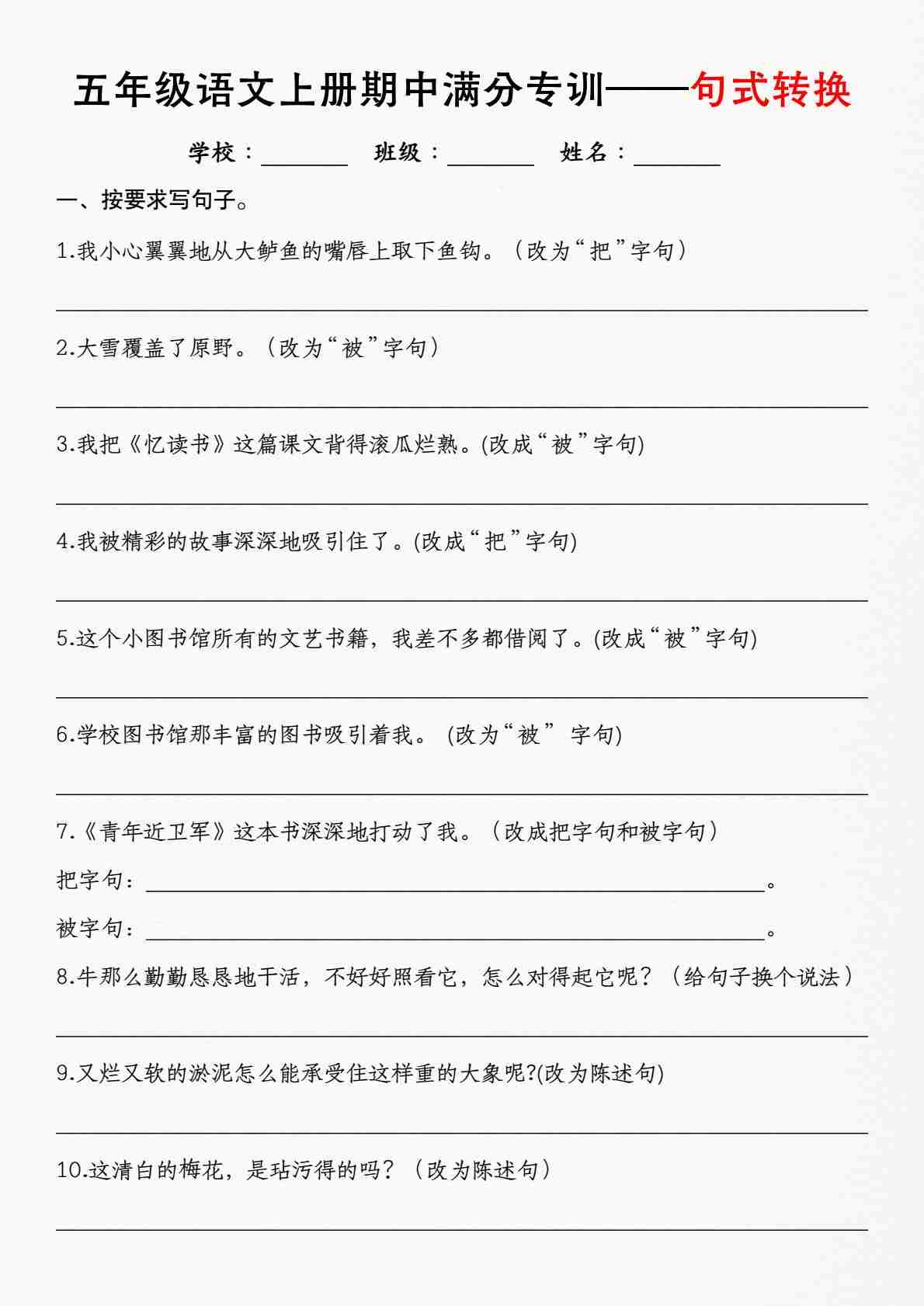 五(上)语文期中满分专训——句式转换》