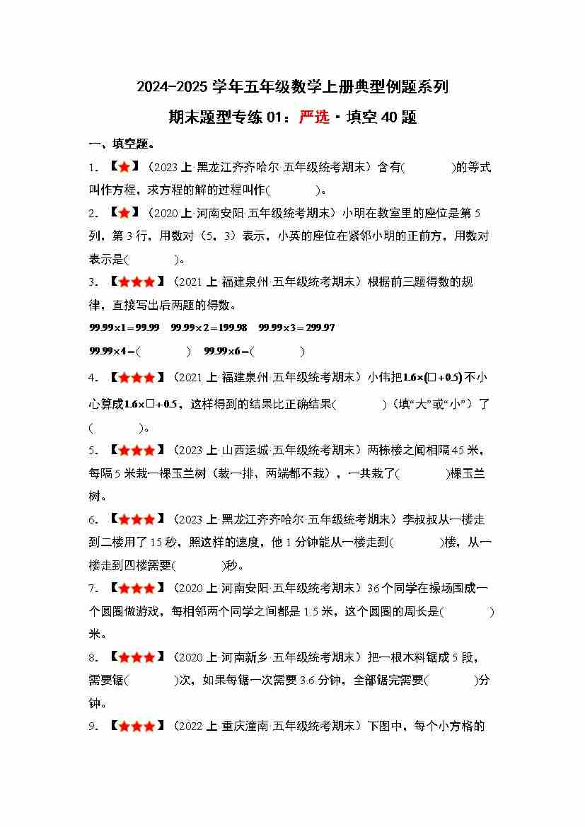 五上人教版数学【期末题型专练01:严选·填空40题】.