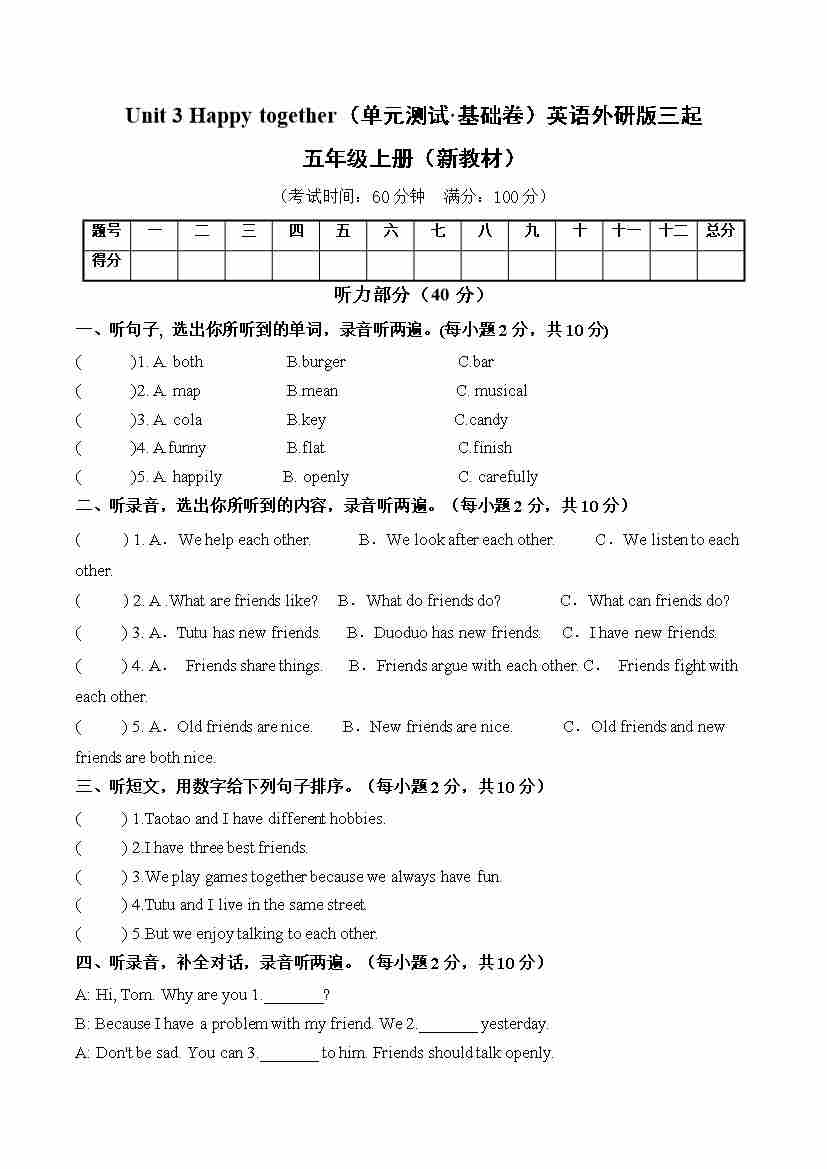 Unit 3 Happy together (单元测试·基础卷)英语外研版三起五年级上册(新教材)6
