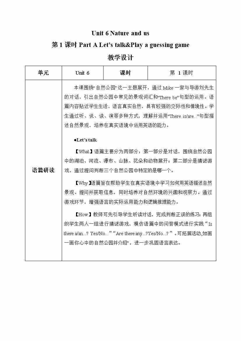 首页 > 全部 > 教学设计 > Unit 6 第1课时 Part A Let’s talk&Play a guessing game(教学设计)(新教材)