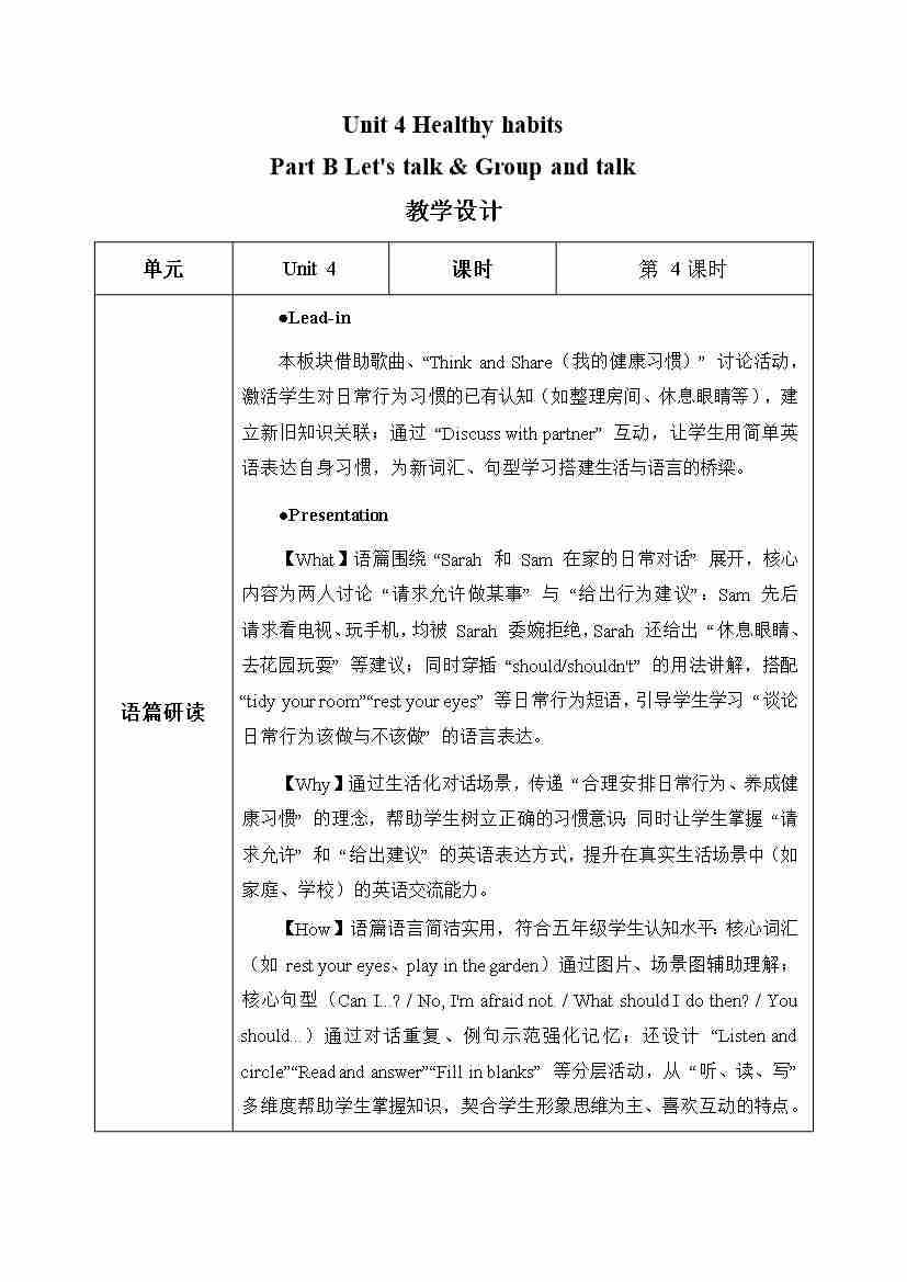 Unit 4 第4课时 Part B Let's talk & Group and talk(教学设计) (新教材)