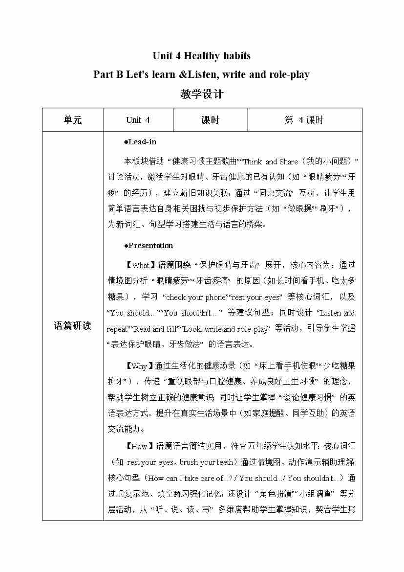 Unit 4 第5课时 Part B Let's learn &Listen, write and role-play(教学设计) (新教材)