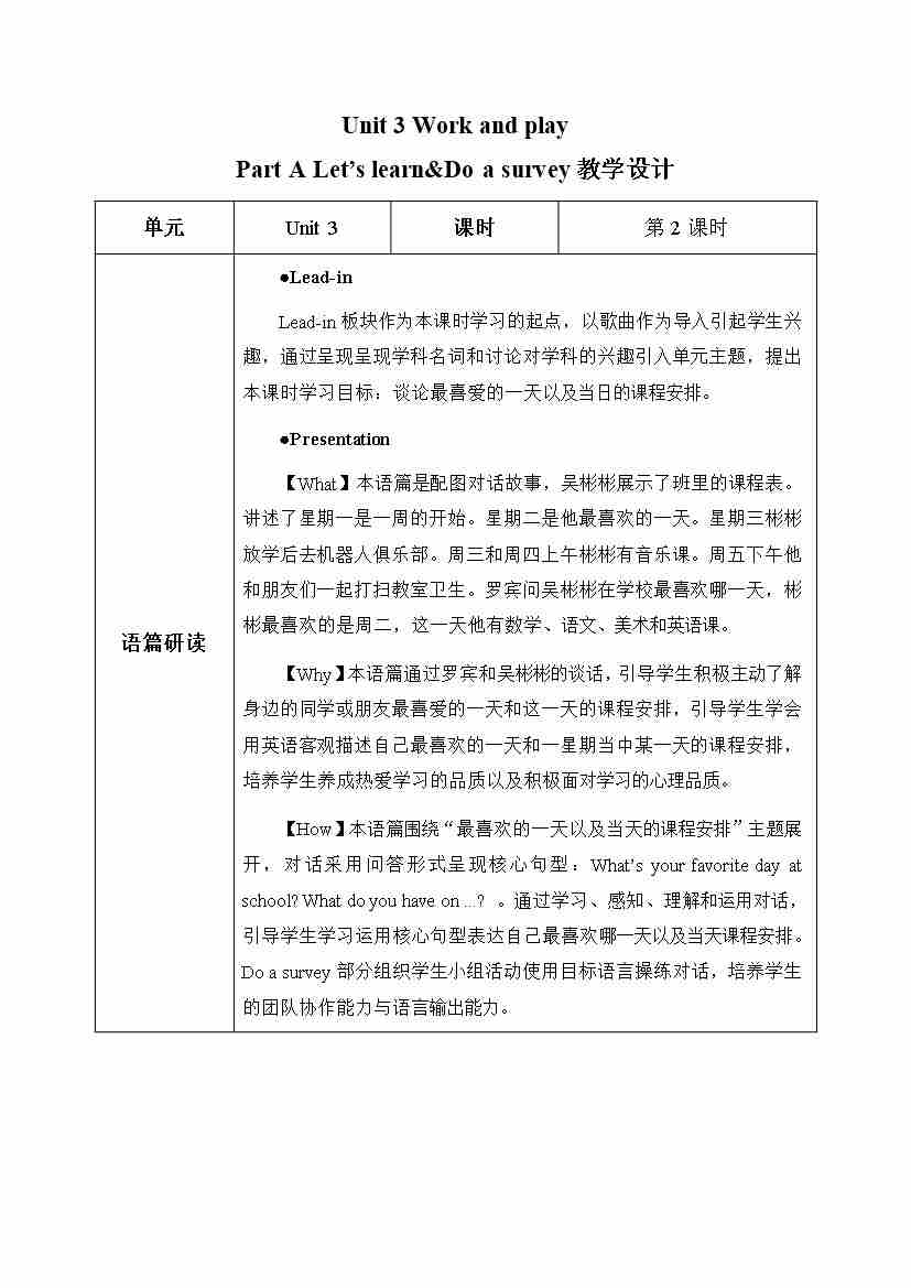 Unit 3 第2课时 Part A Let's learn&Do a survey (教学设计)(新教材)