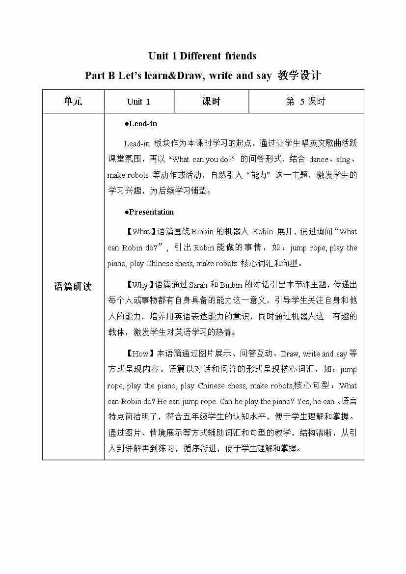 Unit 1 第5课时 Part B Let’s learn&Draw, write and say(教学设计) (新教材)