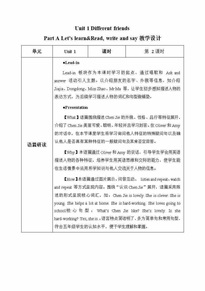 Unit 1 第2课时 Part A Let’s learn&Read, write and say(教学设计) (新教材)